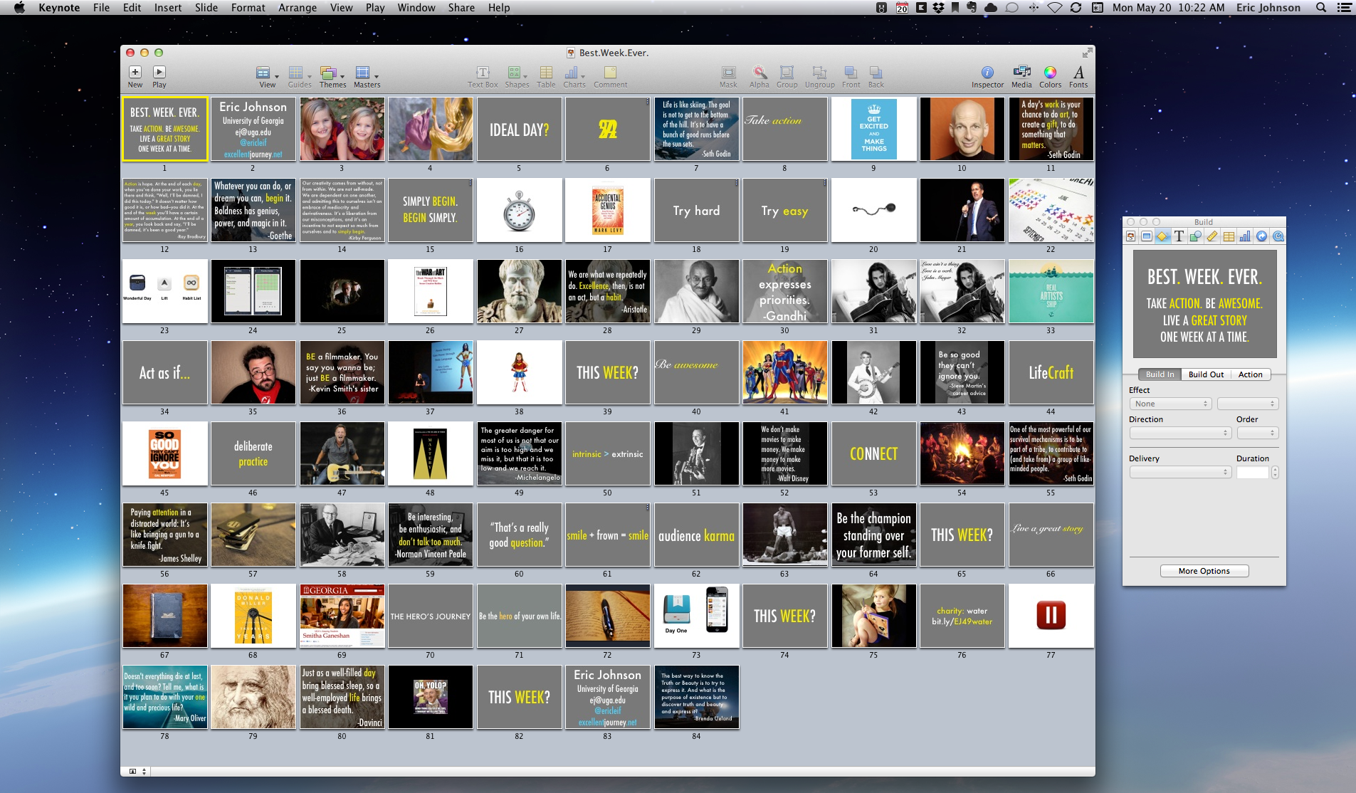I came up with a title and short description months ago so it could be promoted in the conference program, and I immediately created a Keynote document that I’ve been dumping ideas into ever since. It’s a “kitchen sink” approach. Any thought or quote or image that seems remotely interesting and relevant gets dropped in over the course of several months. But only in the last couple of weeks have I begun putting it all together. I love Keynote. (For those who don’t know, Keynote is Apple’s version of slide software. It’s a beautiful, smart app that blows Powerpoint away.) I spend most of my time in Keynote in the “Light Table” view. It’s a great perspective for seeing connections between ideas and assessing the flow of your thoughts. Keynote is a powerful tool to plan projects in, even if you don’t need presentation slides. Here’s what my presentation looks like at the moment: