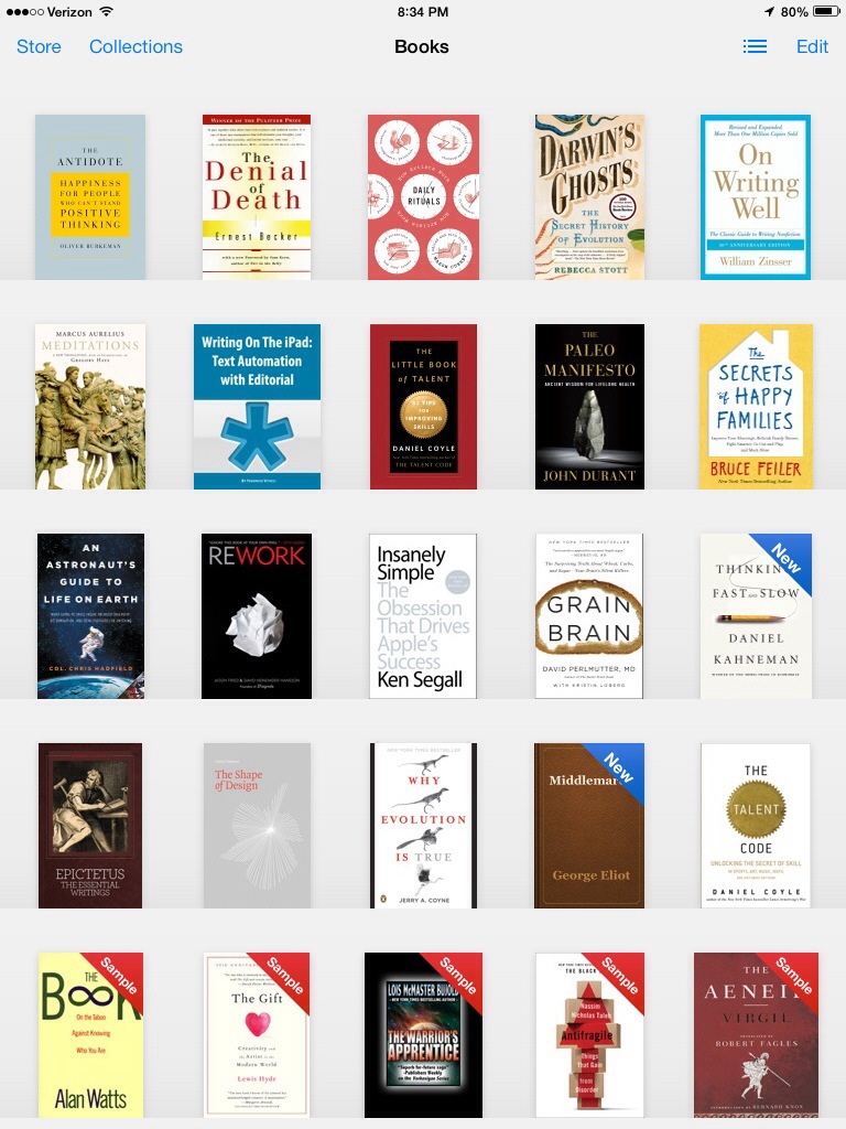 I’ve gone to iBooks as my primary reading app. Books just look better in iBooks compared to the Kindle app. iBooks allows for a natural ragged right margin, which is so much more appealing than the jarring full justification of Kindle titles. And I’m kind of digging the scrolling option that iBooks offers rather than standard page turns.