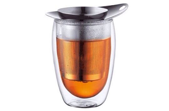 And there’s this tea cup. Beautiful to admire, a pleasure to hold. The double-walled glass is ideal for hot tea. I can wrap my hands around the warm brew as well as see the rich color of the tea. The infuser fits perfectly inside. (The infuser that comes with it is fine, but I upgraded to an even better infuser that prevents even the smallest debris of the tea leaves from getting into the cup.) This tea cup is a delightful part of my morning routine. The tea would taste the same from any old mug, but this great cup makes drinking tea a more wonderful experience.