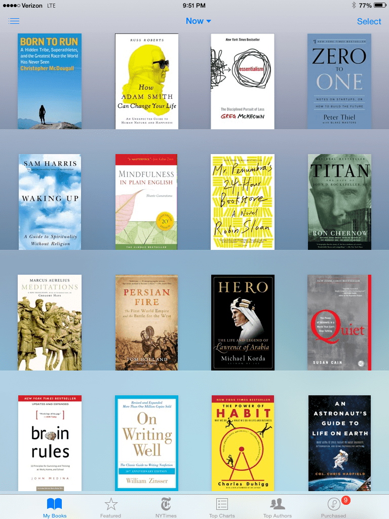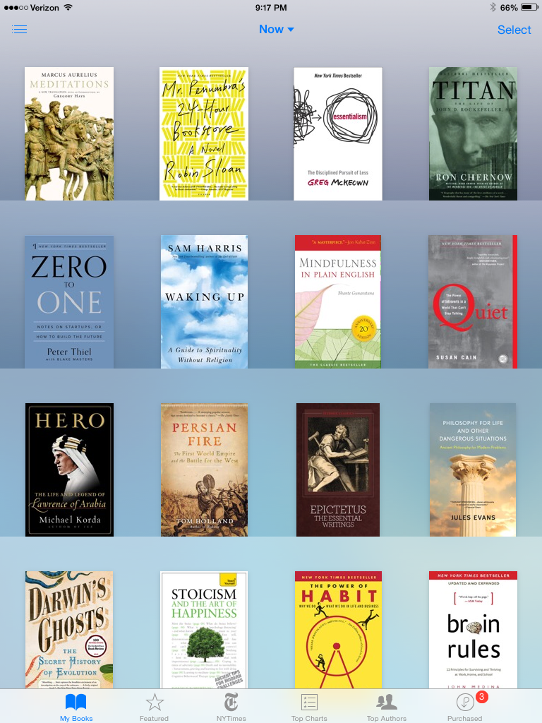 I continue to have plenty of unread books in my iBooks app. Some have been sampled. Others have been begun and put on hold. And a few are untouched. (I’m probably, though, on my fifth reading of Meditations.)