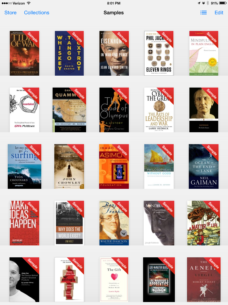 I’ve got a good collection of unread non-fiction in my iBooks library, but I can’t resist searching for new discoveries. I keep a separate collection of book samples I’ve downloaded. It’s a great way to remind myself of books to consider and try them out before purchasing.